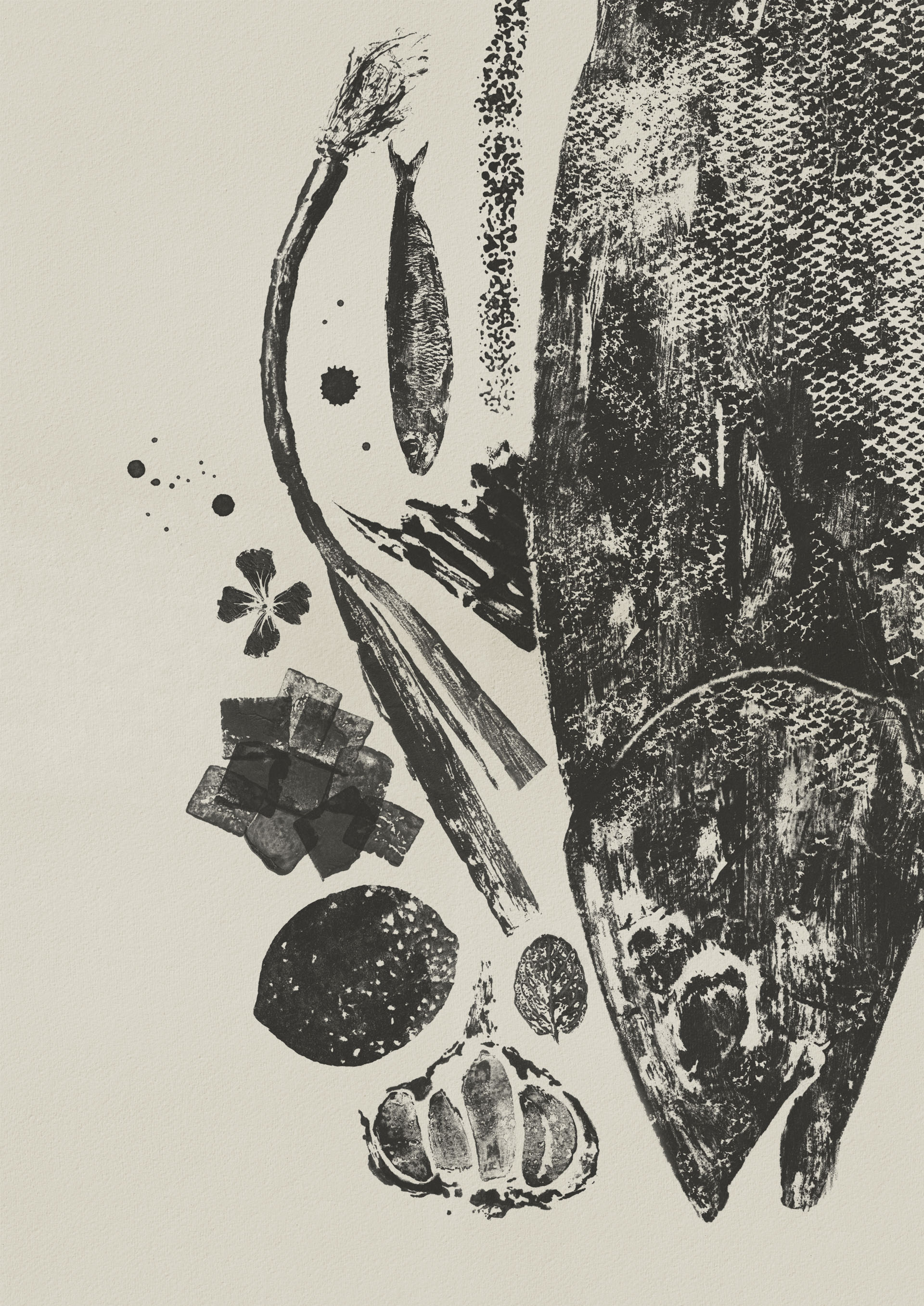 We took recipes from each of the chefs attending the festival and 'Gyotuku' printed each of the ingredients. Gyotuku is a traditional Japanese art form where inks or pigments are applied directly to the relief surface of fish, leaves and/or other relatively flat natural subjects in order to capture images of their sizes, shapes, surface textures, and delicate vein or scale patterns. Following the chefs recipe we then combined these 'ingredients' to create colourful and texturally rich artworks representing each dish.